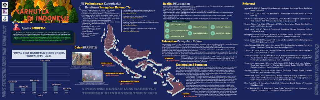 Berdasarkan hasil riset yang dilakukan oleh Bidang Riset dan Teknologi HMPS Statistika FMIPA UNM Tahun 2021 dapat disimpulkan bahwa KARHUTLA Di Indonesia yang terbakar tahun 2016-2021 terbanyak pada tahun 2019 yaitu 1,649,258.00 hektar dan di tahun 2021 turun menjadi 52,481.00 hektar. Sedangkan urutan wilayah karhutla di Indonesia yaitu :