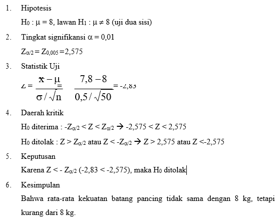 Sebuah perusahaan alat olahraga mengembangkanjenisbatang pancing sintetik, ingin menguji apakah alat pancing tersebut memiliki kekuatan dengan nilai tengah 8 kg. Diketahui bahwa simpangan baku adalah 0,5 kg. Ujilah hipotesis tersebut, bila suatu contoh acak 50 batang pancing itu setelah di tes memberikan nilai tengah 7,8 kg. Gunakan taraf nyata 0,01.