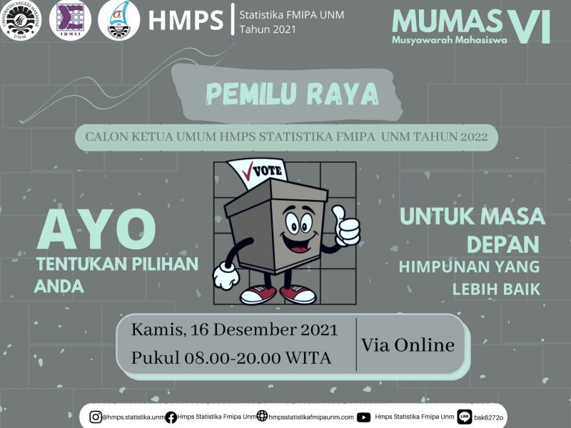 Pemilu Raya Calon Ketua Umum HMPS Statistika FMIPA UNM Tahun 2022 (16/12/21) Pada hari Kamis, tepatnya dimulai pada jam 08.00-20.00 WITA, dilaksanakan kegiatan Pemilu Raya Calon Ketua Umum oleh seluruh masyarakat atau mahasiswa aktif Program Studi Statistika. Dimana pelaksanaan kegiatannya ini berlangsung Via Online, dengan adanya Pemilu Raya kali ini diharapkan seluruh Masyarakat Statistika dapat...Read More