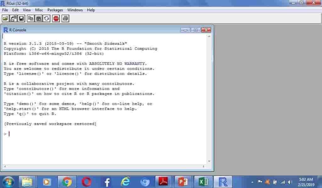 - Setelah R terinstal pada komputer dan dijalankan, akan terlihat prompt “>” yang menunjukkan bahwa R siap menunggu perintah