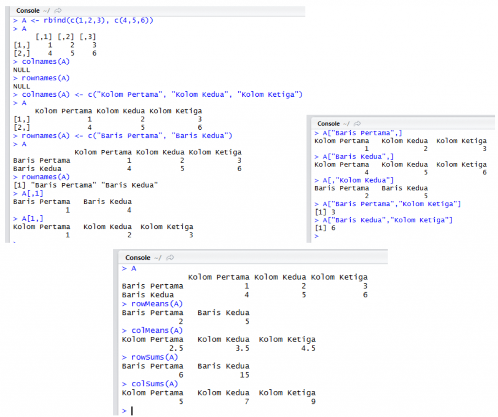 Gambar 9 menampilkan berbagai cara untuk menampilkan elemen matriks. Berdasarkan Gambar 9, perintah R A[,c(1)] berarti menampilkan elemen-elemen matriks A pada kolom ke-1, yakni 1, 2, dan 3. Perintah R A[,-c(2:4)] berarti menampilkan elemen-elemen matriks A, selain dari pada kolom ke-2 sampai ke-4. Dengan kata lain, berarti menampilkan elemen-elemen matriks A pada kolom ke-1, yakni 1, 2, dan 3. Perintah R A[,c(1,4)] berarti menampilkan elemen-elemen matriks A pada kolom ke-1 dan ke-4. Perintah R A[,c(2:4)] berarti menampilkan elemen-elemen matriks A pada kolom ke-2 sampai ke-4. Perintah R A[c(1,3),] berarti menampilkan elemen-elemen matriks A pada baris ke-1 dan ke-3.