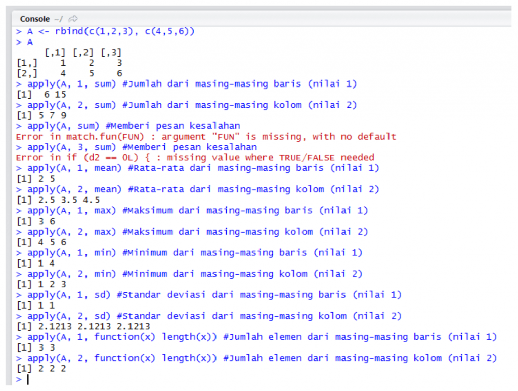 • Perintah R apply(A, sum) memberikan pesan kesalahan, begitu juga dengan perintah R apply(A, 3, sum).
