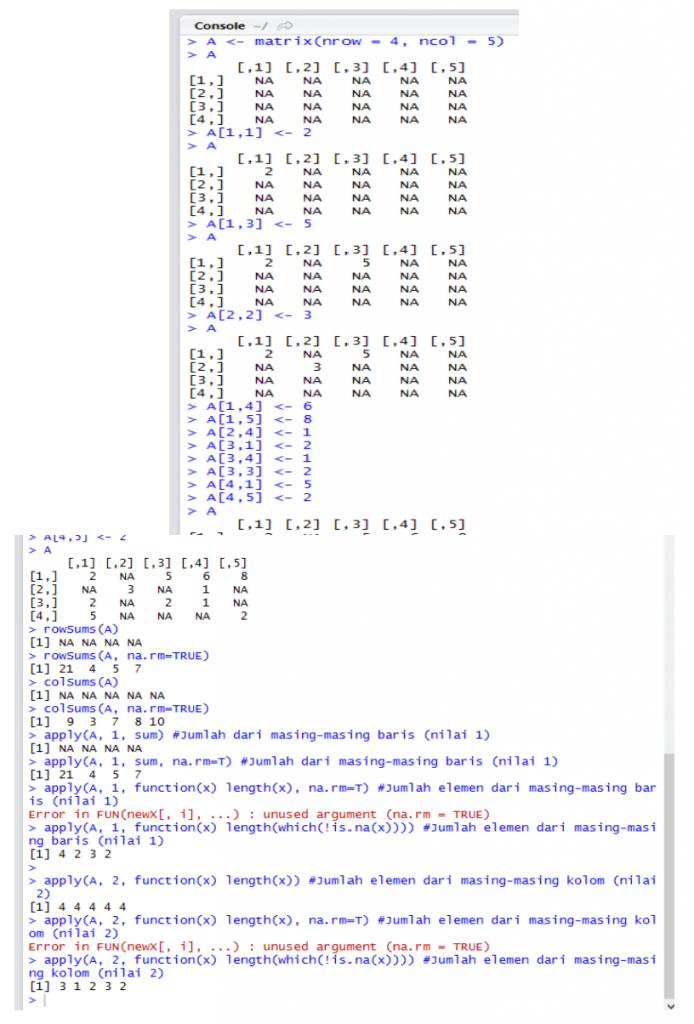 • Perintah R rowSums(A) bertujuan untuk menjumlahkan bilangan-bilangan berdasarkan baris. Namun hasil dari perintah rowSums(A) adalah NA NA NA NA.