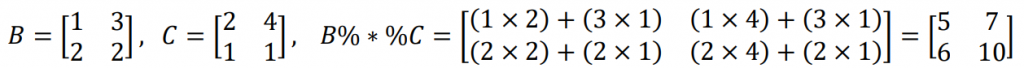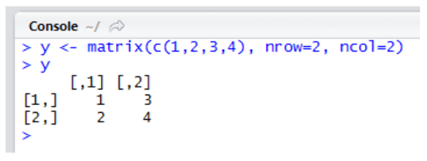 Pada Gambar 1 digunakan fungsi matrix( ) untuk membuat matriks. Perintah R y <- matrix(c(1,2,3,4), nrow=2, ncol=2) dapat diartikan membuat suatu matriks dengan nama “y”, jumlah baris sebanyak 2, dan jumlah kolom sebanyak 2. Elemen-elemen pada matriks y adalah 1, 3, 2, dan 4. Diketahui: