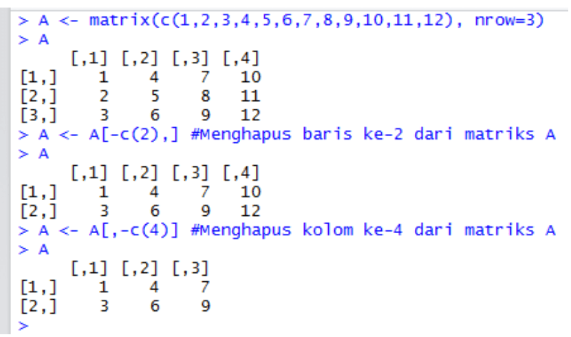Pada perintah R A <- A[-c(2), ] bertujuan untuk menghapus baris ke-2 dari matriks A. Sementara perintah R A <- A[, -c(4)] bertujuan menghapus kolom ke-4 dari matriks A.