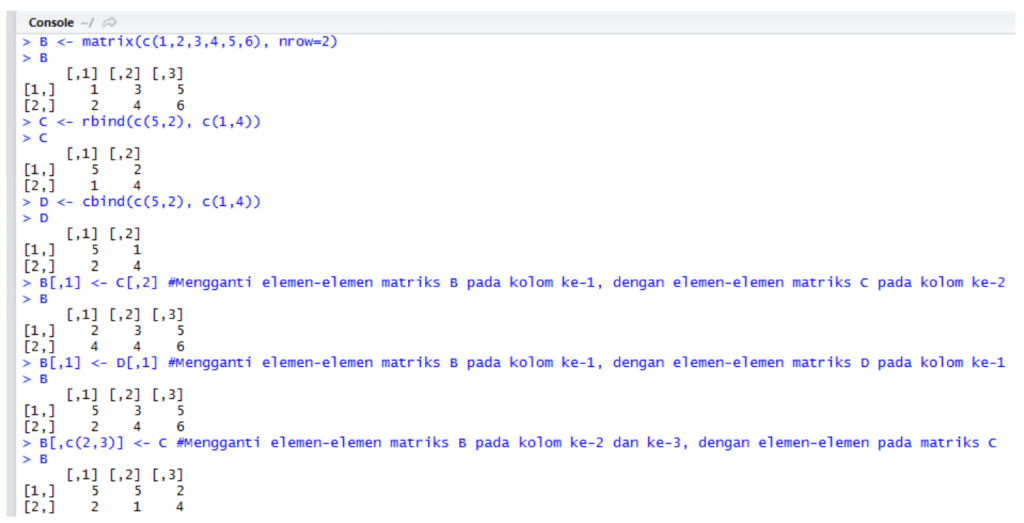Pada Gambar 11 dan Gambar 12 diberikan berbagai contoh perintah R untuk mengganti elemen matriks. Berdasarkan Gambar 11, diberikan matriks B, C, dan D. Diketahui digunakan fungsi rbind(58) untuk membuat matriks C, sementara fungsi cbind( ) digunakan untuk membuat matriks D. Berdasarkan Gambar 11, Perintah R B[,1] <- C[,2] berarti mengganti elemen-elemen matriks B pada kolom ke-1, dengan elemen-elemen matriks C pada kolom ke-2.Perintah R B[,1] <- D[,1] berarti mengganti elemen-elemen matriks B pada kolom ke-1, dengan elemen-elemen matriks D pada kolom ke-1. Perintah R B[,c(2,3)] <- C berarti mengganti elemen-elemen matriks B pada kolom ke-2 dan ke3, dengan elemen-elemen pada matriks C. Perintah R B[c(1),] <- D[c(2),] mengganti elemen-elemen matriks B pada baris ke-1, dengan elemen-elemen pada matriks D, baris ke-2. Namun memberikan informasi kesalahan