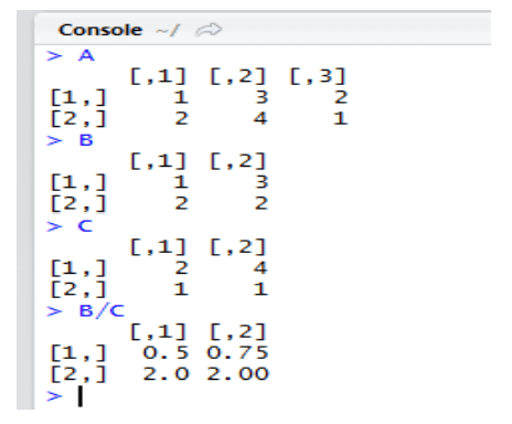 Pada Gambar 6, perintah R z[1,]berarti menampilkan elemen-elemen dari matriks z pada baris ke-1, yakni 1 dan 2. Perintah R z[2,] berarti menampilkan elemen-elemen dari matriks z pada baris ke-2, yakni 3 dan 4. Perintah Rz[,1] berarti menampilkan elemen-elemen dari matriks z pada kolom ke-1, yakni 1, 3, dan 5.