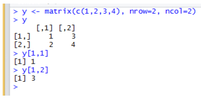 Perintah R y[1,1] berarti menampilkan nilai pada matriks y, pada posisi baris ke-1 dan kolom ke-1, yakni 1. Perintah R y[1,2] berarti menampilkan nilai pada matriks y, pada posisi baris ke-1 dan kolom ke-2, yakni 3, dan seterusnya. Perhatikan Gambar 2.