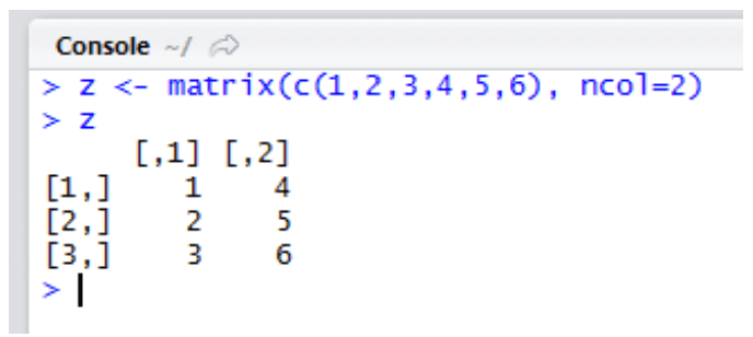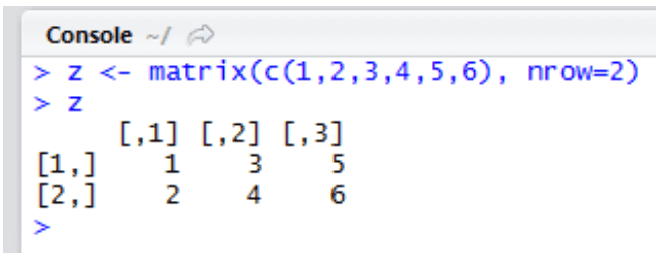 Pada Gambar 3, perintah R z <- matrix(c(1,2,3,4,5,6), nrow=2) dapat diartikan membuat suatu matriks bernama z, yang jumlah barisnya sebanyak 2. Elemen-elemen pada matriks z adalah 1, 2, 3, 4, 5, dan 6. Perhatikan bahwa: