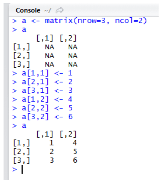Perhatikan Gambar 7 perintah R a <- matrix(nrow=3, ncol=2) berarti membentuk matriks bernama a, dengan jumlah baris sebanyak 3 dan jumlah kolom sebanyak 2. Pada awalnya, elemen dari matriks a adalah NA (not available).