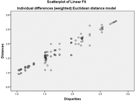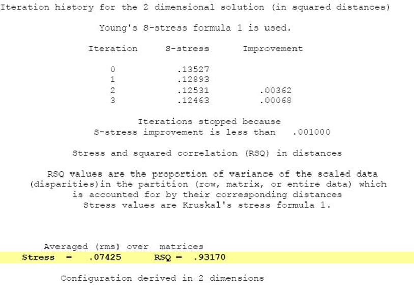 Nilai S-stress yang didapat sebesar 0.07425 atau 7.25% yang berarti bahwa model cukup memiliki kelayakan yang baik (fit). Demikian nilai RSQ yang cukup tinggi yaitu 0.93170 (93,17%), dimana nilai interpretasi RSQ sama halnya seperti R-square dalam regresi linier.