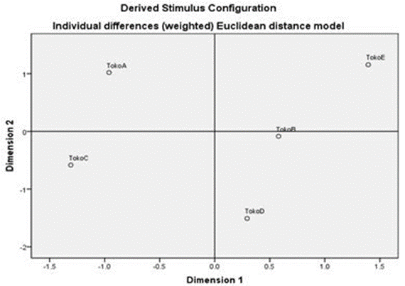 Grafik Derived Stimulus Configuration diatas terdapat pengelompokan toko. Terlihat bahwa toko B mempunyai kemiripan dengan Toko D karena berada dalam kudran yang sama. Sedangkan toko C,toko A dan Toko E tidak memilik kemiripan dengan yang lain karena masing-masing berada dalam kuadran yang berbeda.
