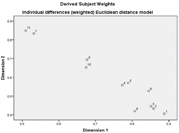 Grafik derived subject weight di atas, terlihat posisi ke 11 responden, dapat dibentuk sebuah garis lurus ke kanan bawah. Hal ini memberikan gambaran bahwa responden memiliki konsistensi dalam menilai kemiripan kelima toko tersebut. Grafik ini untuk menguji keselarasan responden dalam penilaian toko.