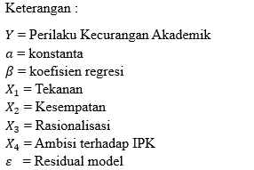 Terdapat tiga variabel independent dan satu variabel dependen yang digunakan dalam riset ini. Variabel independent diantaranya : Tekanan (X1), Kesempatan (X2), dan Rasionalisasi (X3), Ambisi terhadap IPK (X4) dan variabel dependen : Perilaku kecurangan akademik (Y).