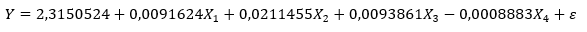 Berdasarkan persamaan regresi, setiap peningkatan satu unit pada variabel X1 akan meningkatkan Y sebesar 0,00916, peningkatan satu unit pada variabel X2 akan meningkatkan Y sebesar 0,02115, dan peningkatan satu unit pada variabel X3 akan meningkatkan Y sebesar 0.00939. Sebaliknya, peningkatan satu unit pada X4 akan menurunkan Y sebesar 0,00089