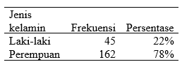 Tabel di atas menunjukkan kebanyakan yang mengisi kuesioner adalah Perempuan dengan jumlah 162 atau 78%.