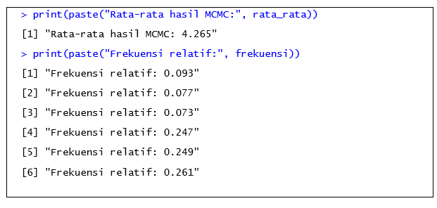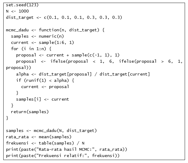 Berdasarkan hasil output, diperoleh rata-rata yang lebih tinggi dari 3,5, yakni 4,265 karena distribusi target lebih berat di angka 4 hingga 6. Selain itu, frekuensi relatif juga akan mendekati distribusi target. Dalam konsep MCMC, setiap lemparan bergantung pada nilai sebelumnya (proses Markov), sehingga cocok untuk sampling distribusi kompleks yang tidak bisa diambil sampelnya secara langsung.