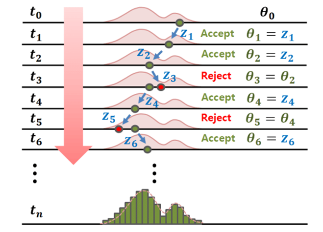 Dikembangkan pertama kali oleh Metropolis pada 1953 dan diperluas oleh Hastings pada 1970, algoritma Metropolis-Hastings merupakan tulang punggung dari metode MCMC. Algoritma ini bekerja dengan membangun rantai Markov yang memiliki distribusi stasioner sesuai dengan distribusi target (posterior) yang kita inginkan. Algoritma ini menggunakan distribusi proposal untuk menghasilkan kandidat sampel baru, kemudian menerima atau menolaknya berdasarkan acceptance ratio (Hastings, 1970).