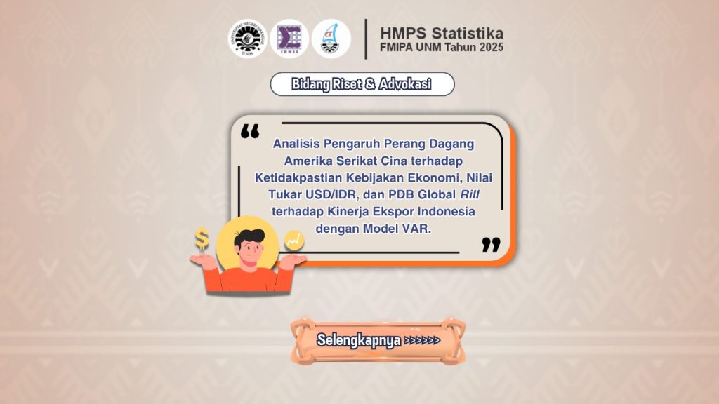 Mengingat kompleksitas hubungan antar variabel ekonomi tersebut, diperlukan pendekatan analisis yang mampu menangkap dinamika interaksi multidimensional antara ketidakpastian kebijakan ekonomi, nilai tukar, PDB riil global, dan kinerja ekspor Indonesia. Model Vector Autoregression (VAR) menjadi alat analisis yang tepat untuk memahami hubungan timbal balik antar variabel dalam sistem ekonomi yang saling terkait. Melalui pendekatan ini, riset ini bertujuan untuk menganalisis pengaruh perang dagang AS-China terhadap kinerja ekspor Indonesia dengan mempertimbangkan berbagai saluran transmisi ekonomi yang relevan, sehingga dapat memberikan pemahaman yang lebih komprehensif tentang dampak geopolitik terhadap perekonomian Indonesia.