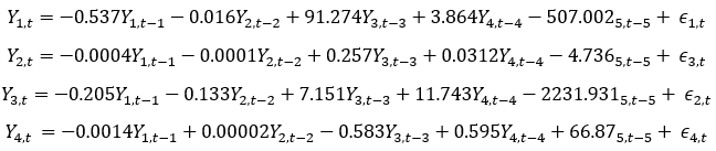 Untuk memahami dampak ketegangan geopolitik antara Amerika Serikat dan Cina terhadap ekspor Indonesia, dilakukan estimasi model VAR(5) yang melibatkan empat variabel utama yaitu, nilai ekspor (Y1), perubahan PDB (Y3), perubahan nilai tukar (Y2), dan indeks ketidakpastian kebijakan ekonomi (Y4). Model VAR(5) yang dihasilkan berdasarkan output estimasi menggunakan software R-Studio adalah sebagai berikut