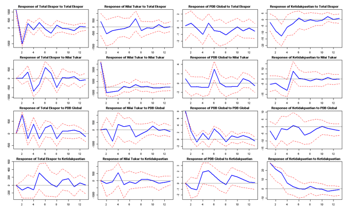 Berdasarkan gambar diatas terlihat bahwa ekspor Indonesia sangat sensitif terhadap perubahan internal dengan fluktuasi tinggi di awal namun cepat stabil. Shock nilai tukar USD/IDR berdampak negatif pada ekspor dalam jangka pendek, sementara pertumbuhan PDB global memberikan efek positif yang signifikan terhadap kinerja ekspor. Ketidakpastian kebijakan ekonomi global menunjukkan dampak negatif berkelanjutan pada ekspor Indonesia. Nilai tukar rupiah merespons tajam terhadap shock internal namun cepat pulih, dan cenderung melemah saat ketidakpastian global meningkat. Pertumbuhan ekonomi global melambat ketika ketidakpastian kebijakan meningkat, sedangkan efek shock ketidakpastian secara bertahap berkurang jika tidak ada shock baru.